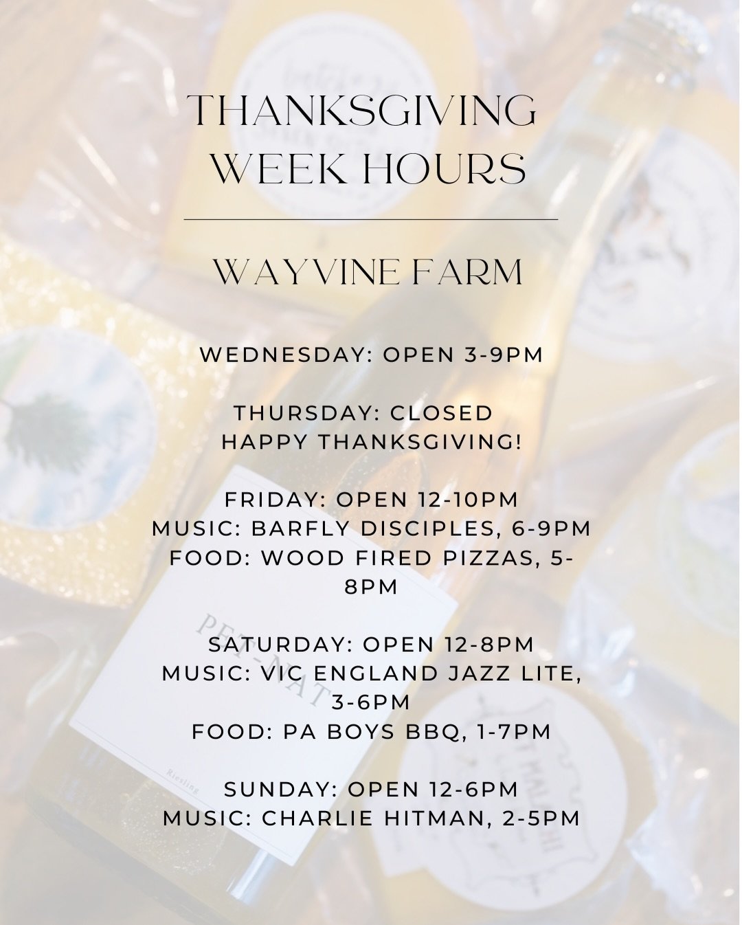 The Wayvine Farm- Nottingham, Pa: Thursday: 4-8pm | Friday: 4pm-9pm | Saturday: 12pm-8pm | Sunday: 12pm-6pm